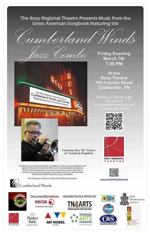 CLARKSVILLE, TN — Jazz lovers will not want to miss the incredible evening of music lined up at Clarksville’s oldest professional live theatre in March. The Cumberland Winds Jazz Combo will present music from the Great American Songbook in the intimate setting of the Roxy Regional Theatre on Friday, March 7, at 7:00pm.