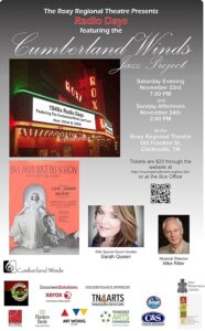 Join us as the Cumberland Winds Jazz Project teams with the Roxy Regional Theatre to recreate an old-time live radio show from the 1940s. Traditional big band music will combine with radio skits, vintage advertisements, and support of the war effort! In the intimate setting of Clarksville’s oldest professional theatre, the Jazz Project will present music from the popular big bands of the 1940s including Glenn Miller, Les Brown, Stan Kenton, Gene Krupa, and Count Basie. The evenings’ featured vocalist will be Sarah Queen singing such all-time favorites such as “I’ve Got a Crush on You,” “Bei Mir Bist du Schön,” “You’re Getting to Be a Habit,” and “Day In, Day Out.” We will feature alto saxophonist Earl Corrothers performing “Stella by Starlight.”
